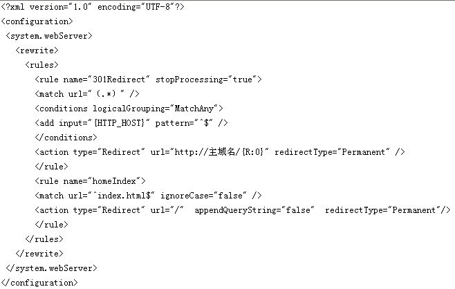 然后就是基于windows平臺下的301重新定向。因為windows平臺下的IIS和Linux的平臺存在著一定的差別,對此需要和IDC供應商進行商討,了解基于windows平臺下的IIS配置。在windows平臺下,可以在根目錄下創建一個web.config文件,然后在這個文件中輸入下面的代碼,具體如下圖所示。